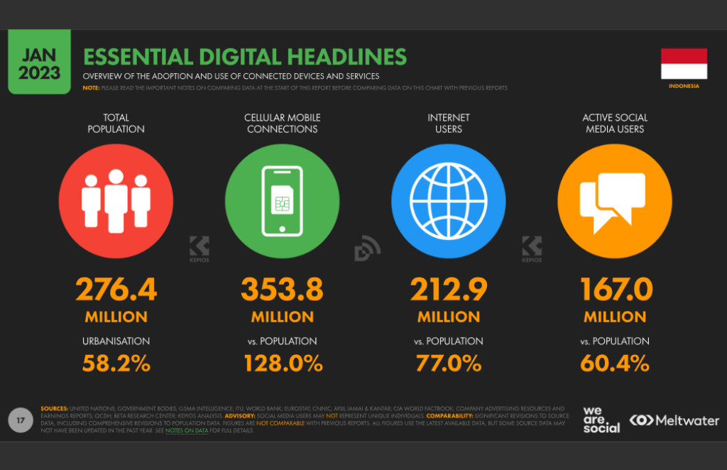 Seperti data yang dirilis oleh We Are Social, Terdapat 212,9 juta pengguna internet di Indonesia pada awal tahun 2023, dengan penetrasi internet sebesar 77,0 persen.